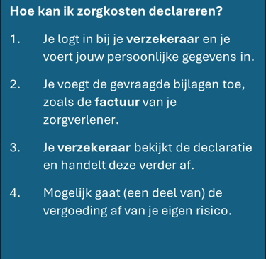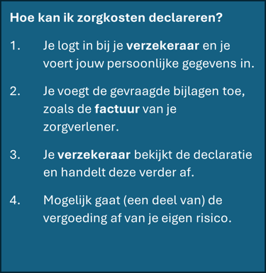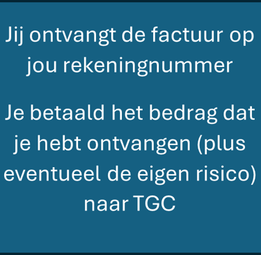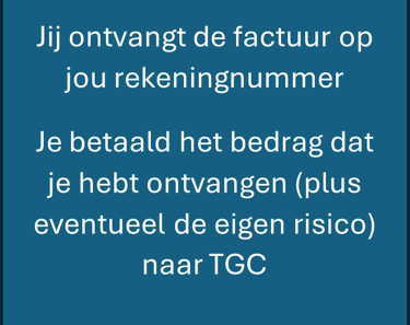 Dit betekend dat jij zelf de factuur van TGC ontvangt. De factuur kan je indienen bij jou zorgverzekering